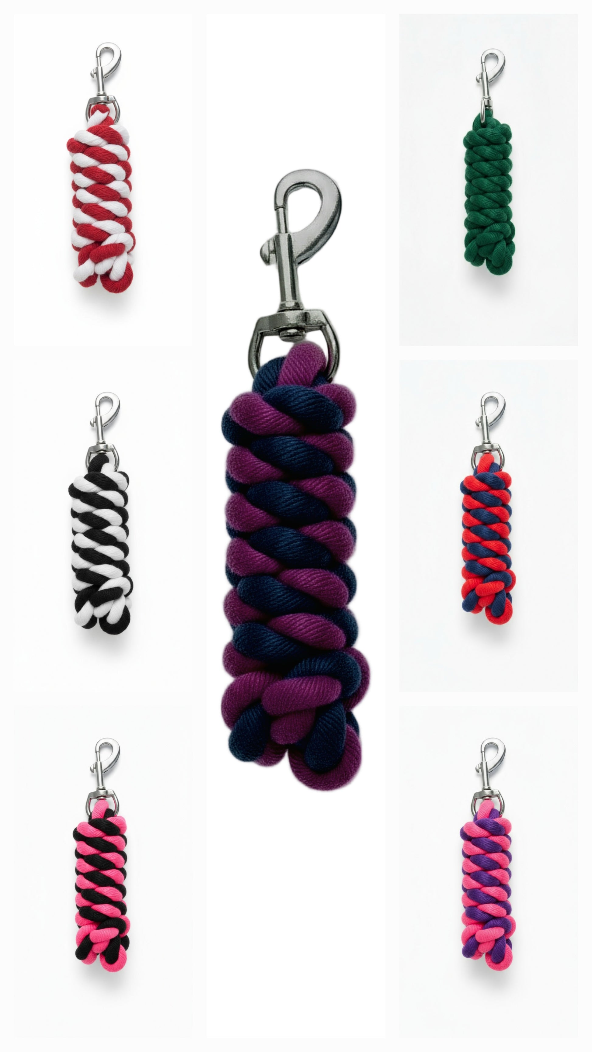 | Cotton leads that will last but are soft to hold and have strong clips. Hand braided for durability and strength. With snap clips and the length 1.8mtrs, these are perfect for around the stables, spares in the float, even dog leads. With a variety of colours you can mix and match to suit. |
